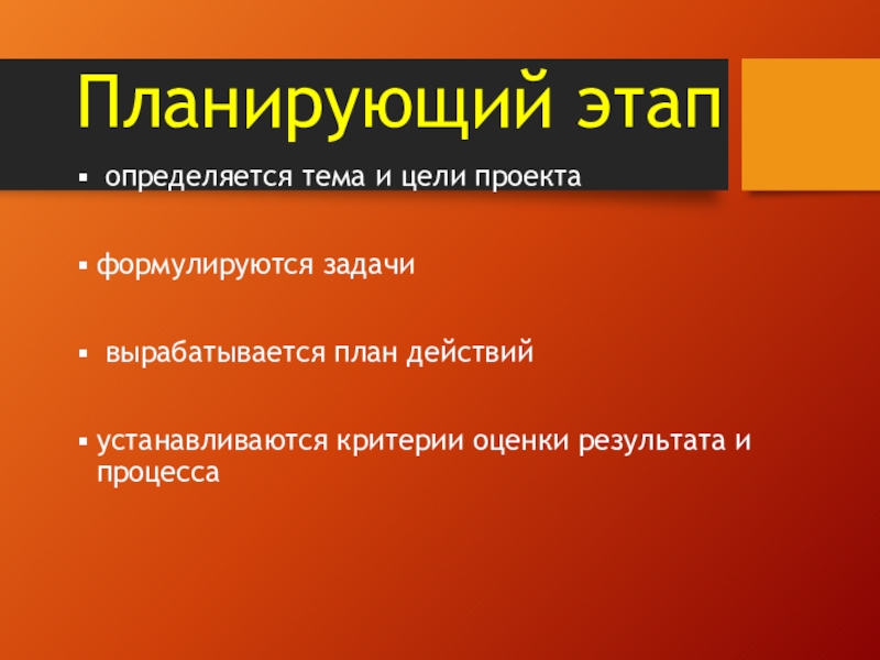 Планирующий этап определяется тема и цели проектаформулируются задачи вырабатывается план действийустанавливаются критерии оценки результата и процесса