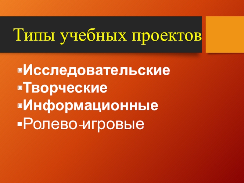 Типы учебных проектовИсследовательские Творческие Информационные Ролево-игровые