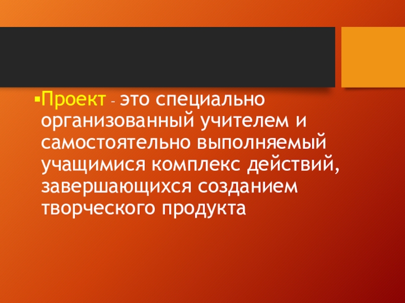 Проект – это специально организованный учителем и самостоятельно выполняемый учащимися комплекс действий, завершающихся созданием творческого продукта