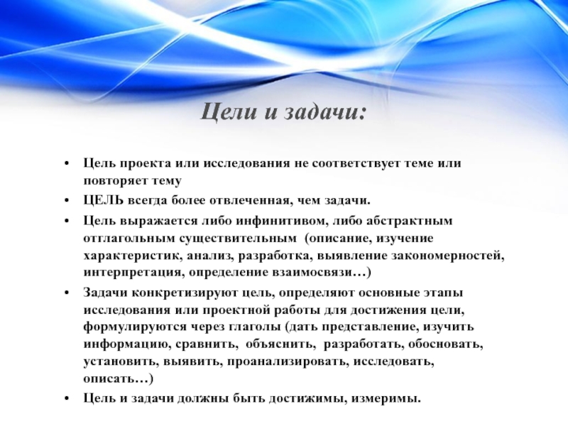 Задачи конкретизируют цель, определяют основные этапы исследования или проектной работы для достижения цели, формулируются через глаголы (дать представление, изучить информацию, сравнить, объяснить, разработать, обосновать, установить, выявить, проанализировать, исследовать, описать…)
