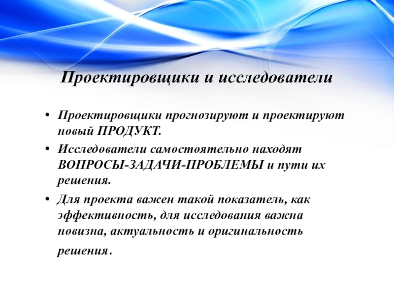 Для проекта важен такой показатель, как эффективность, для исследования важна новизна, актуальность и оригинальность решения.