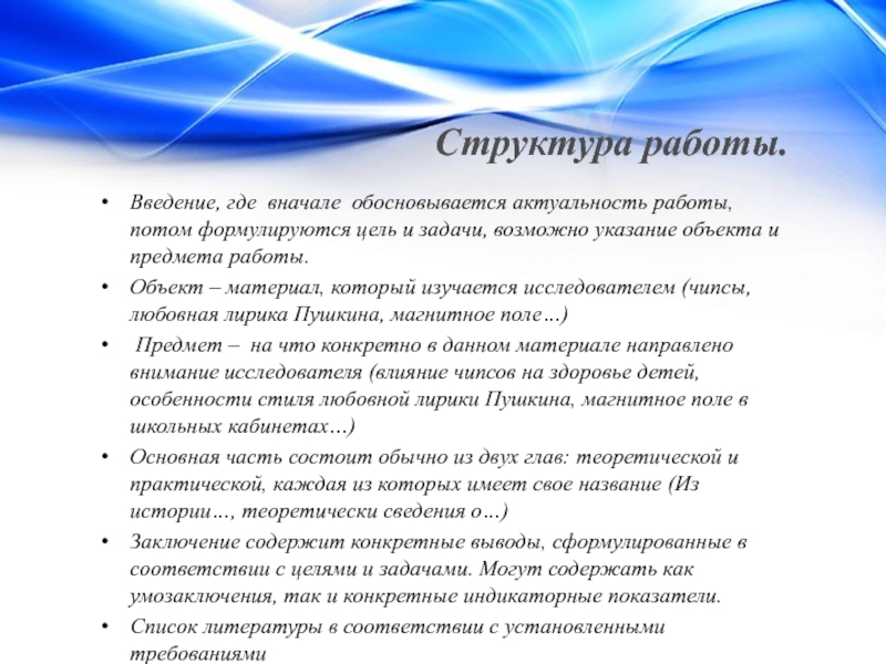 Предмет – на что конкретно в данном материале направлено внимание исследователя (влияние чипсов на здоровье детей, особенности стиля любовной лирики Пушкина, магнитное поле в школьных кабинетах…)