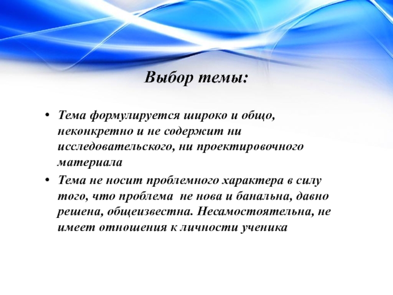 Тема не носит проблемного характера в силу того, что проблема не нова и банальна, давно решена, общеизвестна. Несамостоятельна, не имеет отношения к личности ученика