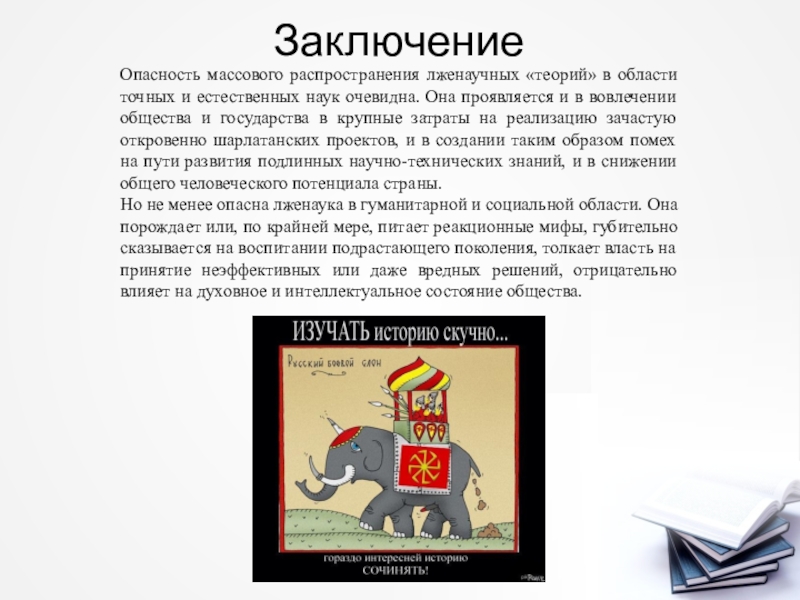 Но не менее опасна лженаука в гуманитарной и социальной области. Она порождает или, по крайней мере, питает реакционные мифы, губительно сказывается на воспитании подрастающего поколения, толкает власть на принятие неэффективных или даже вредных решений, отрицательно влияет на духовное и интеллектуальное состояние общества.