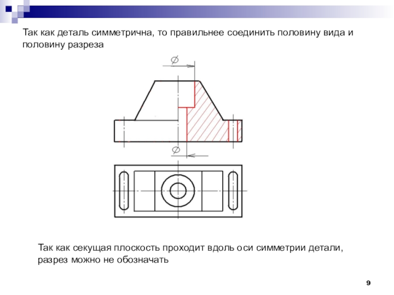Так как секущая плоскость проходит вдоль оси симметрии детали, разрез можно не обозначать