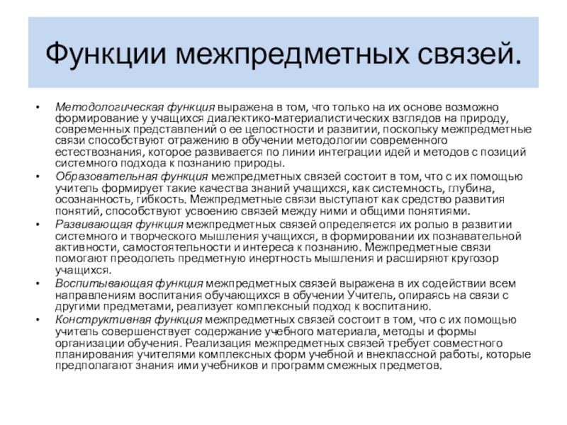 возможно формирование у учащихся диалектико-материалистических взглядов на природу, современных представлений о ее целостности и развитии, поскольку межпредметные связи способствуют отражению в обучении методологии современного естествознания, которое развивается по линии интеграции идей и методов с позиций системного подхода к познанию природы.
