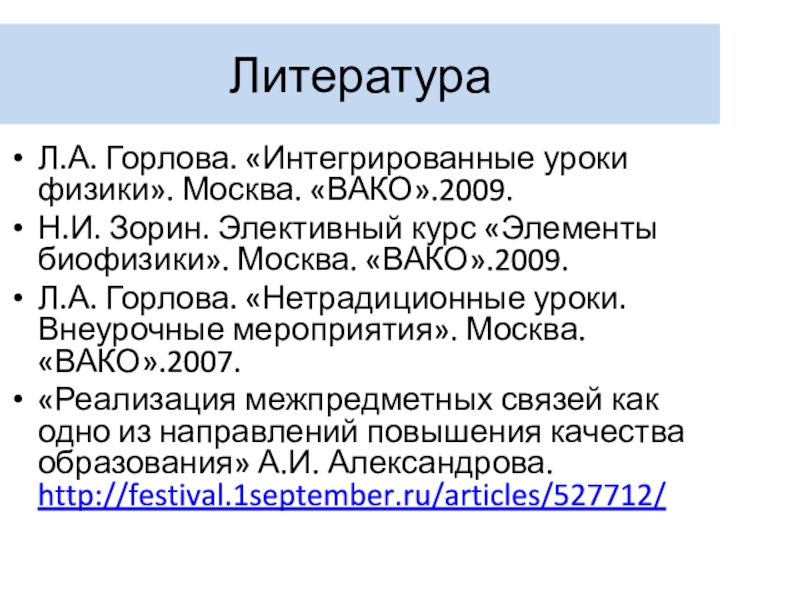 Л.А. Горлова. «Интегрированные уроки физики». Москва. «ВАКО».2009.