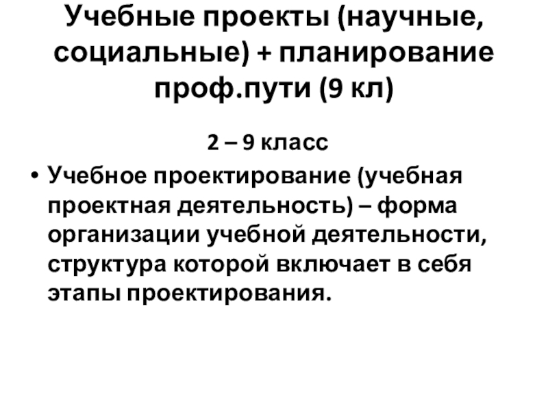 Слайд 7Учебные проекты (научные, социальные) + планирование проф.пути (9 кл)