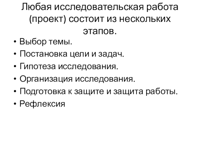 Слайд 19Любая исследовательская работа (проект) состоит из нескольких этапов.