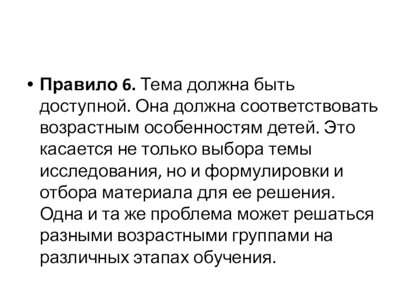 Слайд 15Правило 6. Тема должна быть доступной. Она должна соответствовать возрастным особенностям