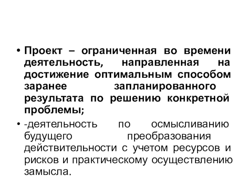 Слайд 2Проект – ограниченная во времени деятельность, направленная на достижение оптимальным способом