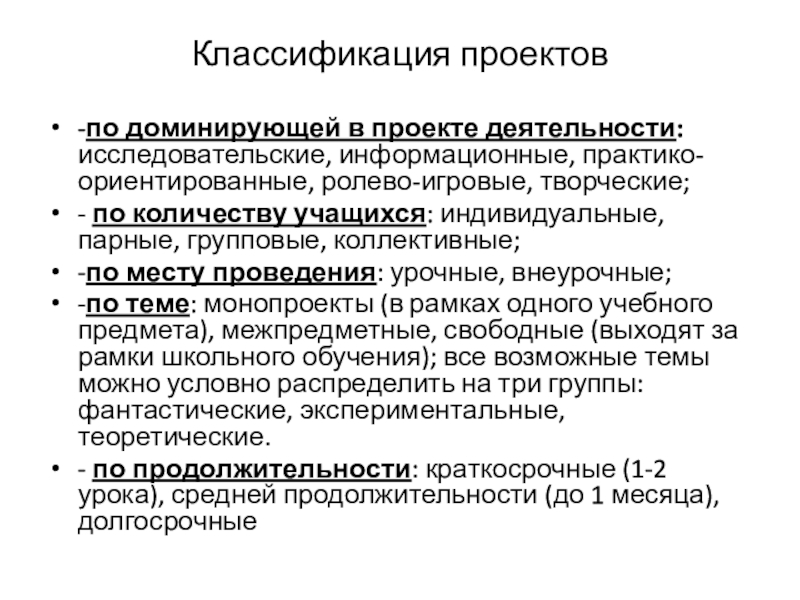-по теме: монопроекты (в рамках одного учебного предмета), межпредметные, свободные (выходят за рамки школьного обучения); все возможные темы можно условно распределить на три группы: фантастические, экспериментальные, теоретические.
