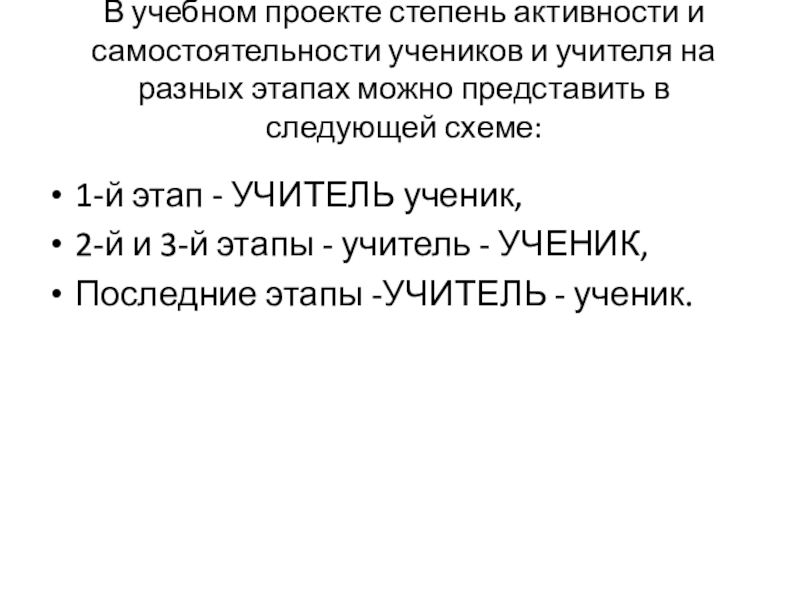 Слайд 20В учебном проекте степень активности и самостоятельности учеников и учителя на