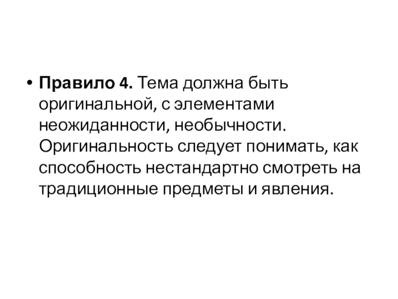 Слайд 13Правило 4. Тема должна быть оригинальной, с элементами неожиданности, необычности. Оригинальность