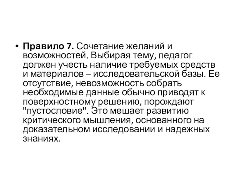 Слайд 16Правило 7. Сочетание желаний и возможностей. Выбирая тему, педагог должен учесть