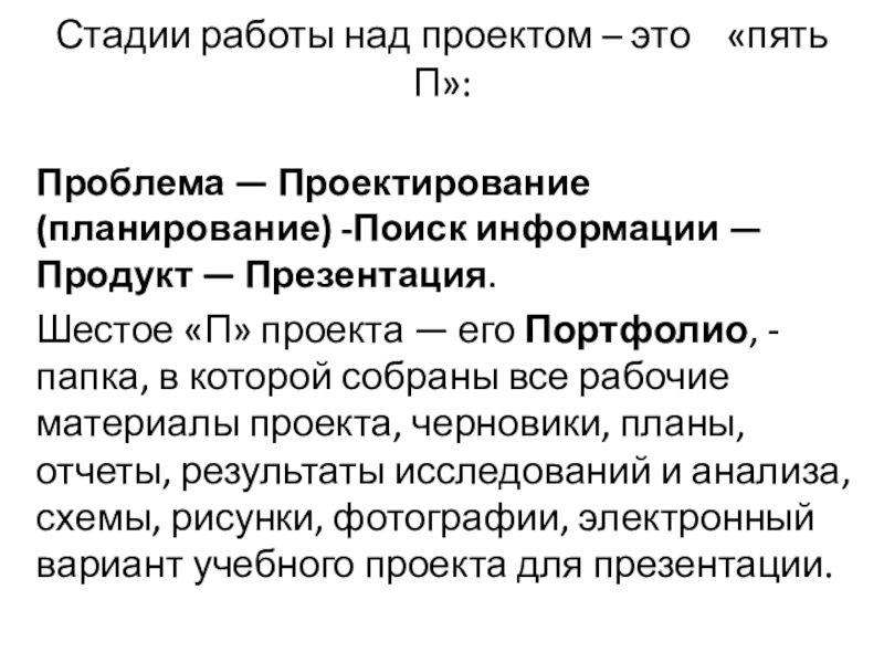 Шестое «П» проекта — его Портфолио, - папка, в которой собраны все рабочие материалы проекта, черновики, планы, отчеты, результаты исследований и анализа, схемы, рисунки, фотографии, электронный вариант учебного проекта для презентации.