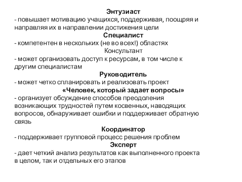 Самое сложное для учителя в ходе проектирования – это роль независимого консультанта. Трудно удержаться от подсказок, особенно если педагог видит, что учащиеся выполняют что-то неверно. Но важно в ходе консультаций только отвечать на возникающие у школьника вопросы.