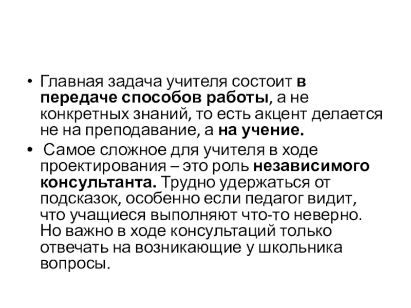 Слайд 22Главная задача учителя состоит в передаче способов работы, а не конкретных