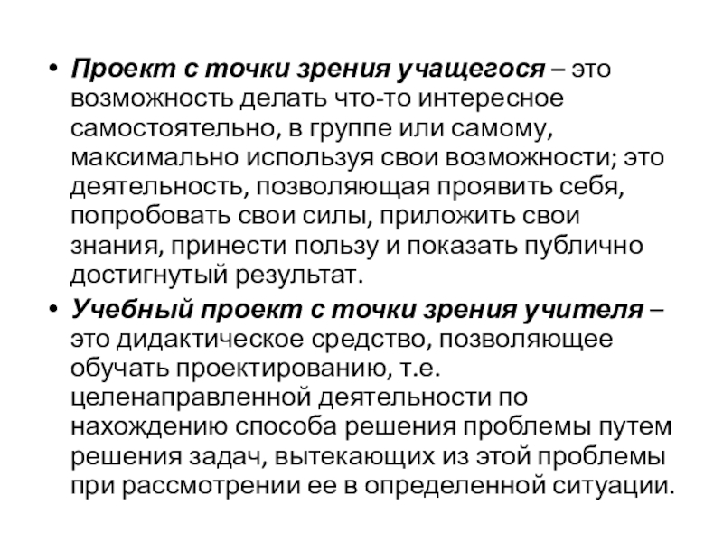 Учебный проект с точки зрения учителя – это дидактическое средство, позволяющее обучать проектированию, т.е. целенаправленной деятельности по нахождению способа решения проблемы путем решения задач, вытекающих из этой проблемы при рассмотрении ее в определенной ситуации.