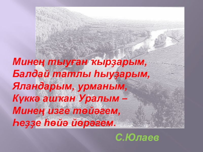 Минең тыуған ҡырҙарым,Балдай татлы һыуҙарым,Яландарым, урманым,Күккә ашҡан Уралым – Минең изге төйәгем,Һеҙҙе һөйә йөрәгем.С.Юлаев