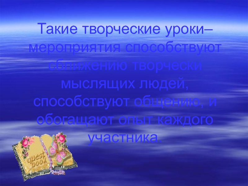 Слайд 18Такие творческие уроки– мероприятия способствуют сближению творчески мыслящих людей, способствуют общению,