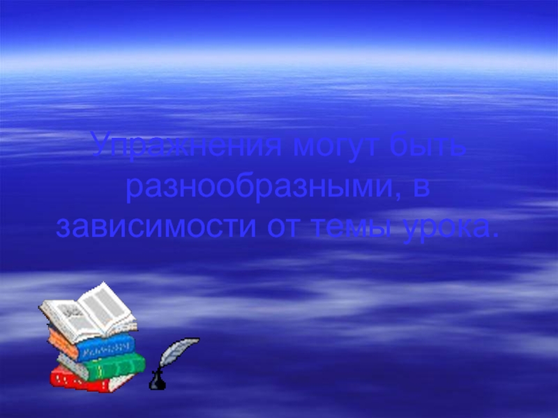 Слайд 6Упражнения могут быть разнообразными, в зависимости от темы урока.
