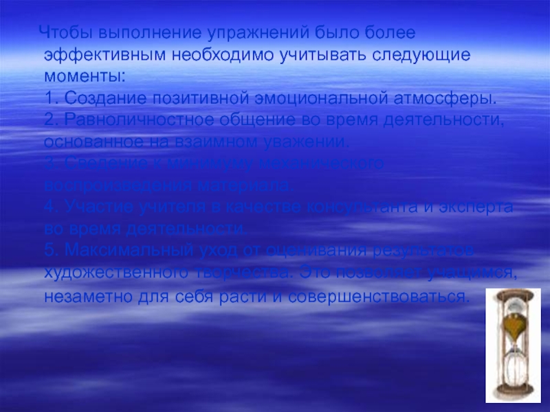 5. Максимальный уход от оценивания результатов художественного творчества. Это позволяет учащимся, незаметно для себя расти и совершенствоваться.
