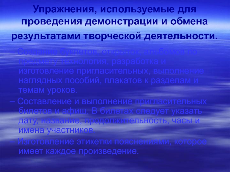 Слайд 17Упражнения, используемые для проведения демонстрации и обмена результатами творческой деятельности.