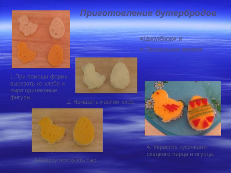 1.При помощи формы вырезать из хлеба и сыра одинаковые фигуры.