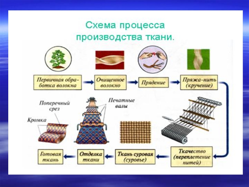 – зарисовка схем получения волокна, нитей, переплетения тканей