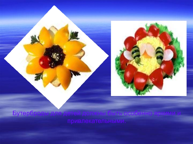 Слайд 12Бутерброды для детей должны быть особенно яркими и привлекательными.