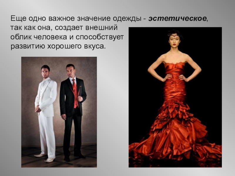 Слайд 4Еще одно важное значение одежды - эстетическое, так как она, создает