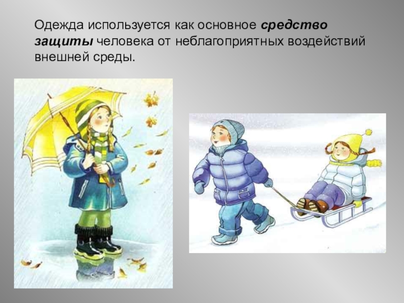 Слайд 3Одежда используется как основное средство защиты человека от неблагоприятных воздействий внешней