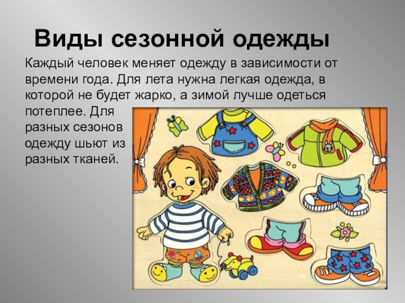 Виды сезонной одеждыКаждый человек меняет одежду в зависимости от времени года. Для лета нужна легкая одежда, в