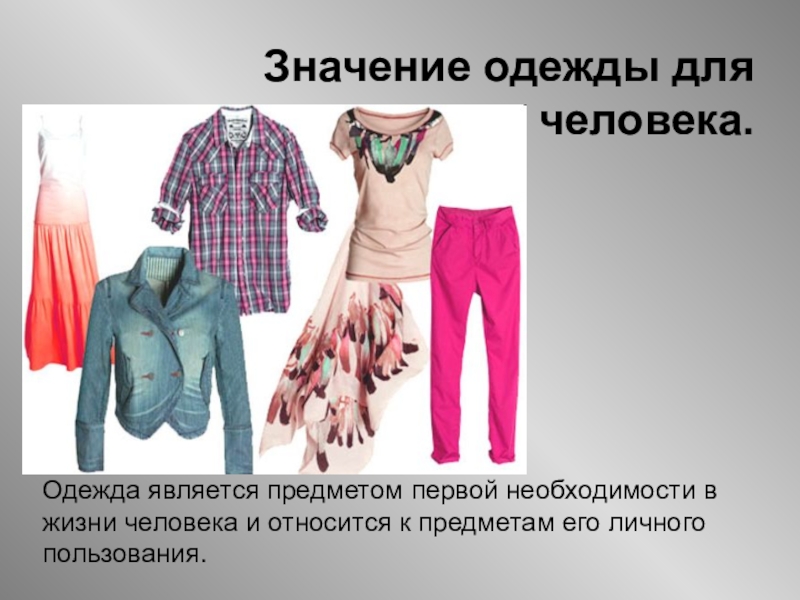Значение одежды для человека.Одежда является предметом первой необходимости в жизни человека и относится к предметам его личного пользования.