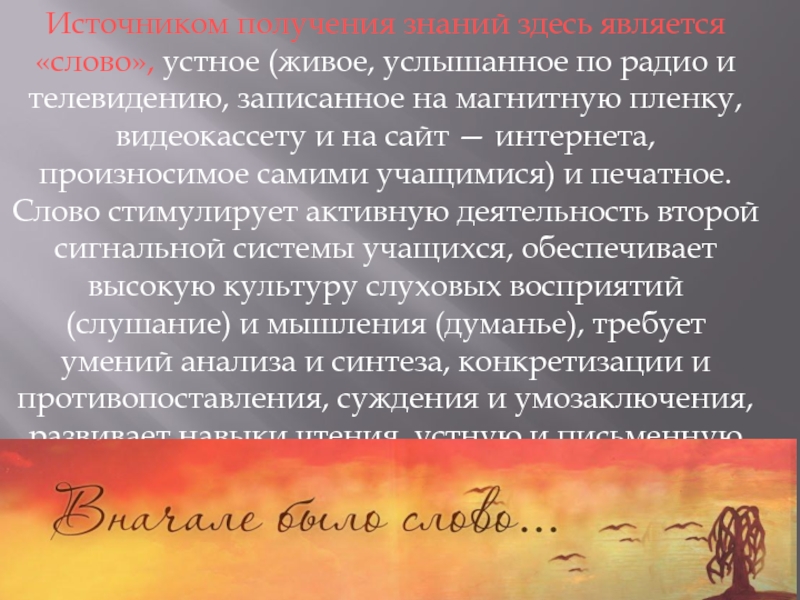 радио и телевидению, записанное на магнитную пленку, видеокассету и на сайт — интернета, произносимое самими учащимися) и печатное. Слово стимулирует активную деятельность второй сигнальной системы учащихся, обеспечивает высокую культуру слуховых восприятий (слушание) и мышления (думанье), требует умений анализа и синтеза, конкретизации и противопоставления, суждения и умозаключения, развивает навыки чтения, устную и письменную речь.