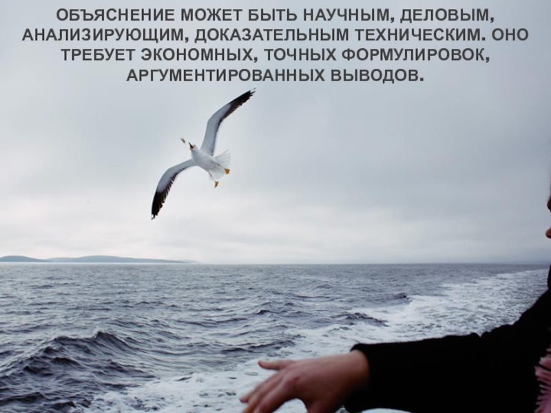 Слайд 6Объяснение может быть научным, деловым, анализирующим, доказательным техническим. Оно требует экономных,