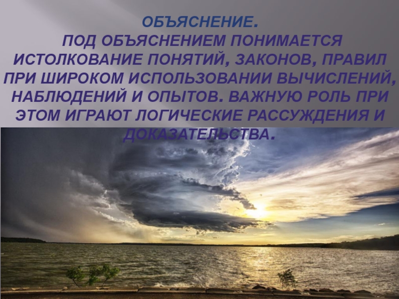Объяснение.  Под объяснением понимается истолкование понятий, законов, правил при широком использовании вычислений, наблюдений и опытов. Важную