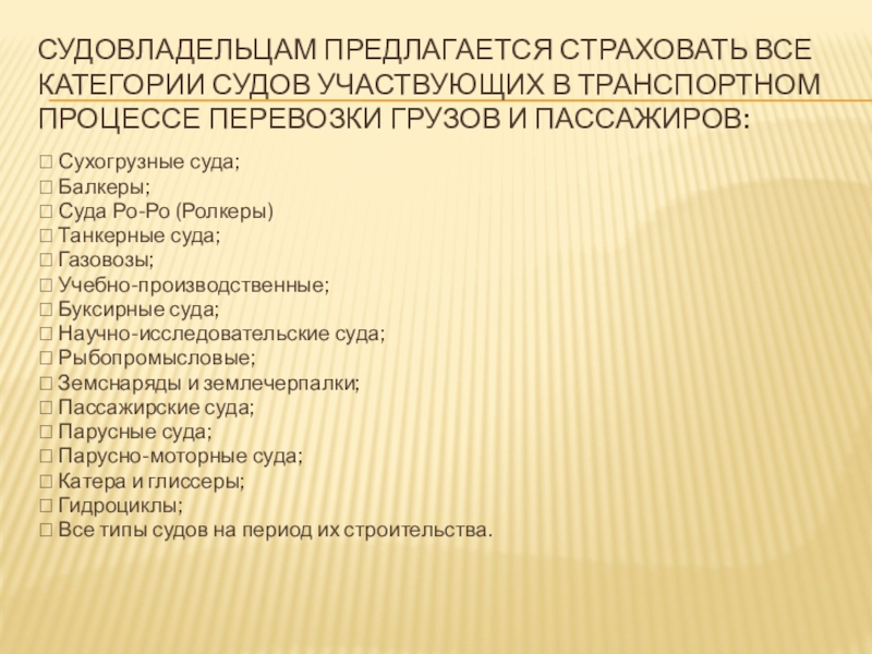 Слайд 14Судовладельцам предлагается страховать все категории судов участвующих в транспортном процессе перевозки