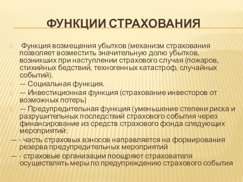— Предупредительная функция (уменьшение степени риска и разрушительных последствий страхового события через финансирование из средств страхового фонда следующих мероприятий: