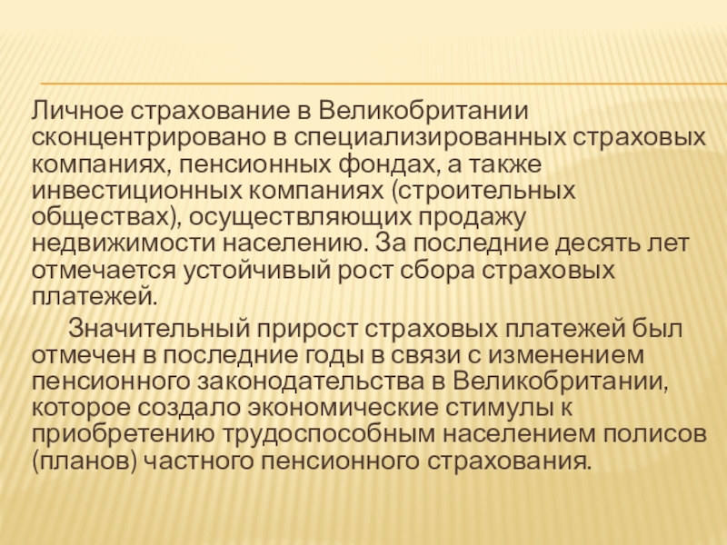 Слайд 28Личное страхование в Великобритании сконцентрировано в специализированных страховых компаниях, пенсионных фондах,