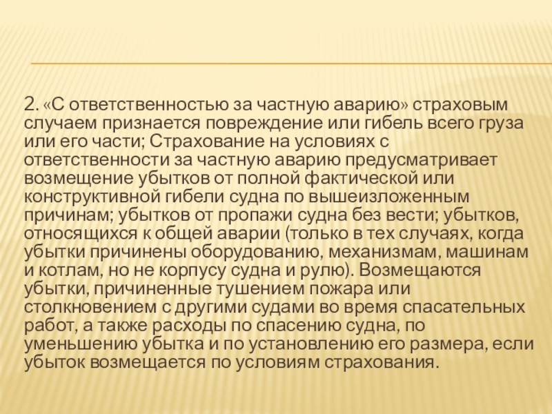 гибель всего груза или его части; Страхование на условиях с ответственности за частную аварию предусматривает возмещение убытков от полной фактической или конструктивной гибели судна по вышеизложенным причинам; убытков от пропажи судна без вести; убытков, относящихся к общей аварии (только в тех случаях, когда убытки причинены оборудованию, механизмам, машинам и котлам, но не корпусу судна и рулю). Возмещаются убытки, причиненные тушением пожара или столкновением с другими судами во время спасательных работ, а также расходы по спасению судна, по уменьшению убытка и по установлению его размера, если убыток возмещается по условиям страхования.