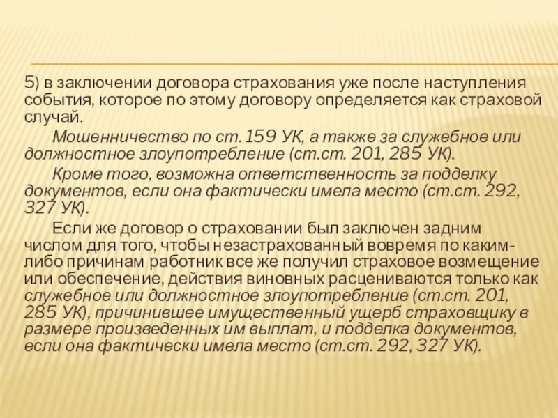 Если же договор о страховании был заключен задним числом для того, чтобы незастрахованный вовремя по каким-либо причинам работник все же получил страховое возмещение или обеспечение, действия виновных расцениваются только как служебное или должностное злоупотребление (ст.ст. 201, 285 УК), причинившее имущественный ущерб страховщику в размере произведенных им выплат, и подделка документов, если она фактически имела место (ст.ст. 292, 327 УК).