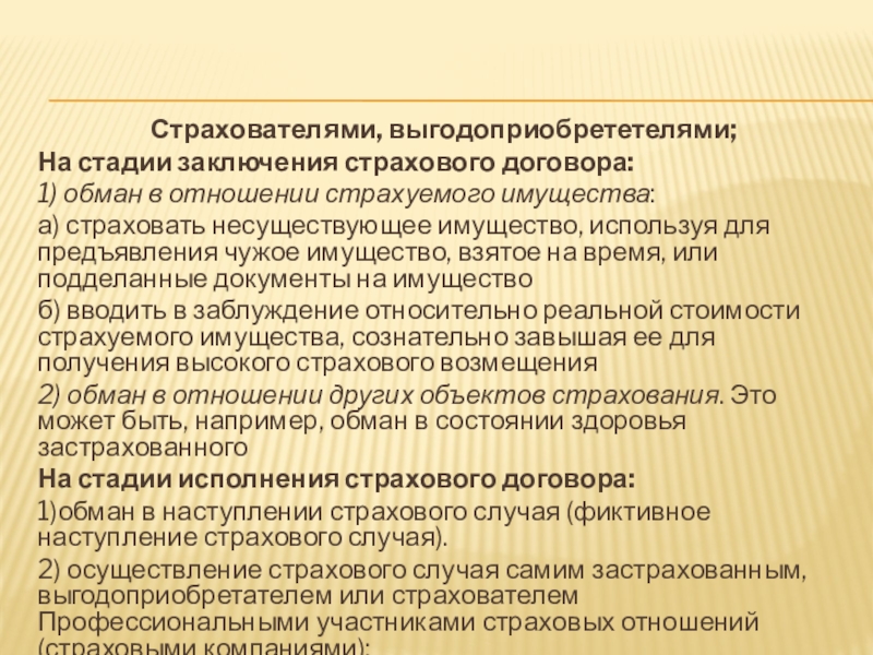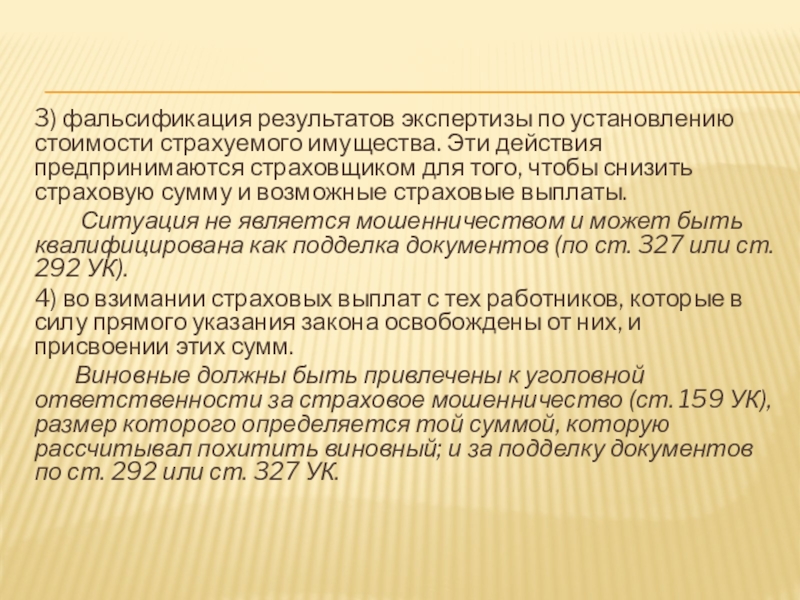 Слайд 413) фальсификация результатов экспертизы по установлению стоимости страхуемого имущества. Эти действия