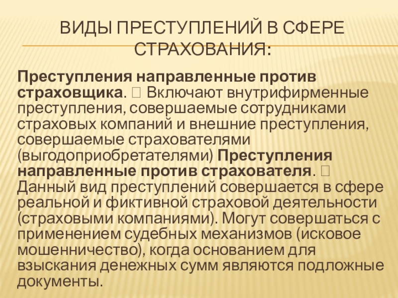 преступления, совершаемые сотрудниками страховых компаний и внешние преступления, совершаемые страхователями (выгодоприобретателями) Преступления направленные против страхователя. Данный вид преступлений совершается в сфере реальной и фиктивной страховой деятельности (страховыми компаниями). Могут совершаться с применением судебных механизмов (исковое мошенничество), когда основанием для взыскания денежных сумм являются подложные документы.