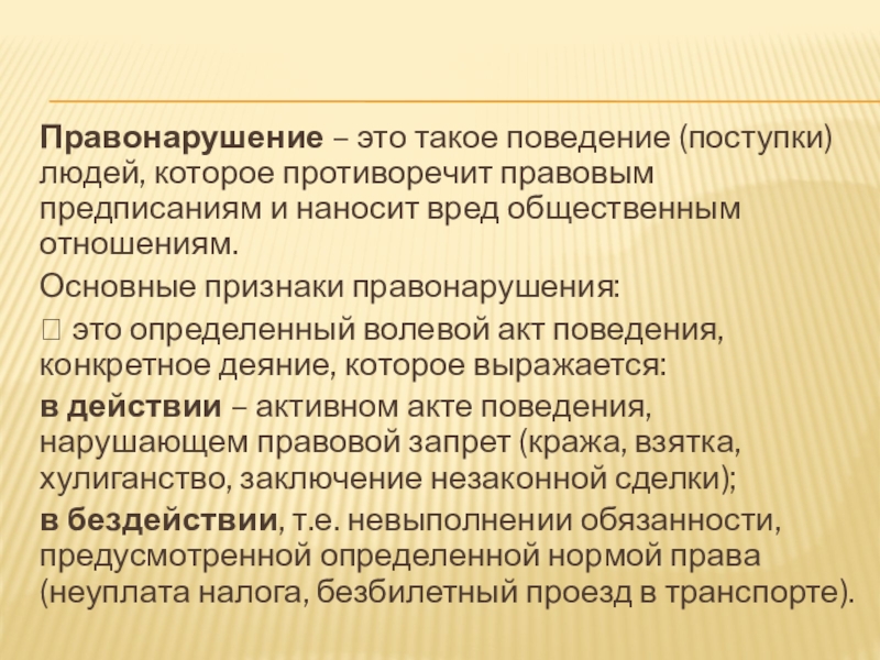 Слайд 31Правонарушение – это такое поведение (поступки) людей, которое противоречит правовым предписаниям