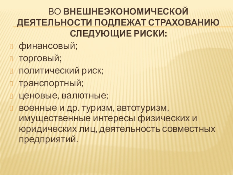Слайд 8Во внешнеэкономической деятельности подлежат страхованию следующие риски: