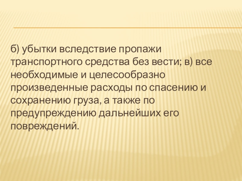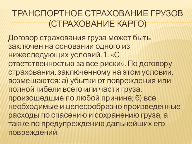 основании одного из нижеследующих условий. 1. «С ответственностью за все риски». По договору страхования, заключенному на этом условии, возмещаются: а) убытки от повреждения или полной гибели всего или части груза, произошедшие по любой причине; б) все необходимые и целесообразно произведенные расходы по спасению и сохранению груза, а также по предупреждению дальнейших его повреждений.
