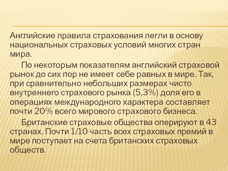 Слайд 26Английские правила страхования легли в основу национальных страховых условий многих стран