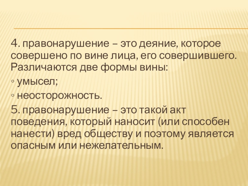 5. правонарушение – это такой акт поведения, который наносит (или способен нанести) вред обществу и поэтому является опасным или нежелательным.